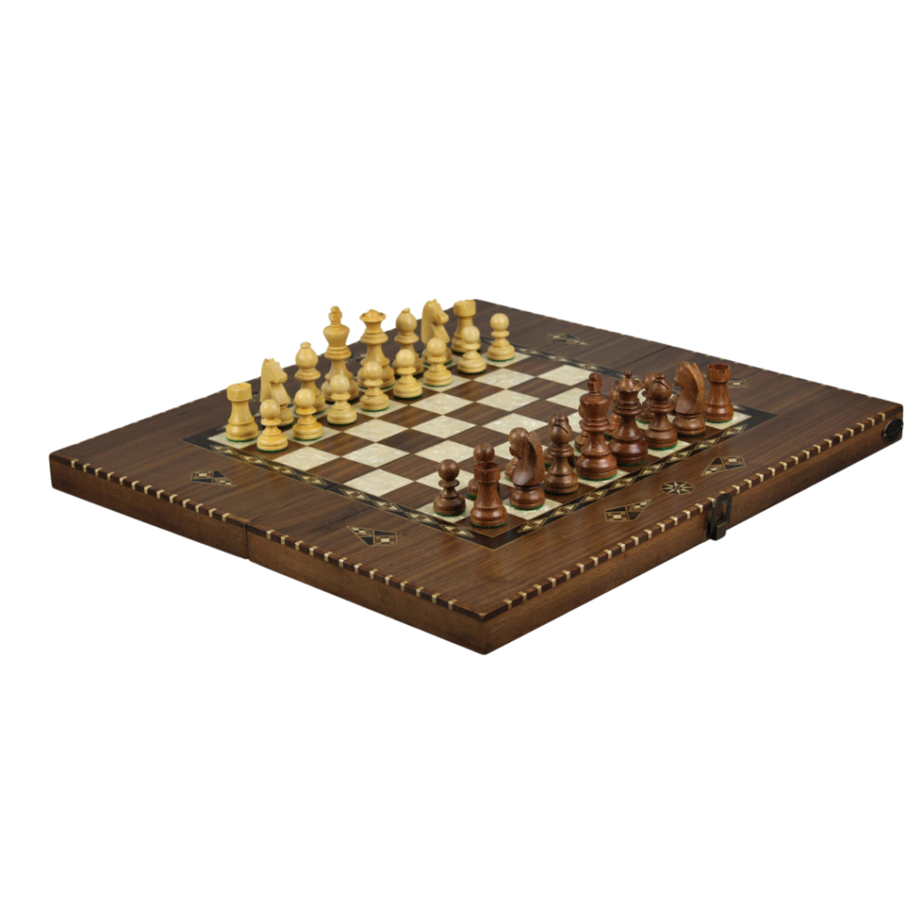 Juego de Ajedrez y Backgammon Rural de Nogal Helena con Piezas de Ajedrez Alemanas Staunton de Sheesham de 20 Pulgadas
