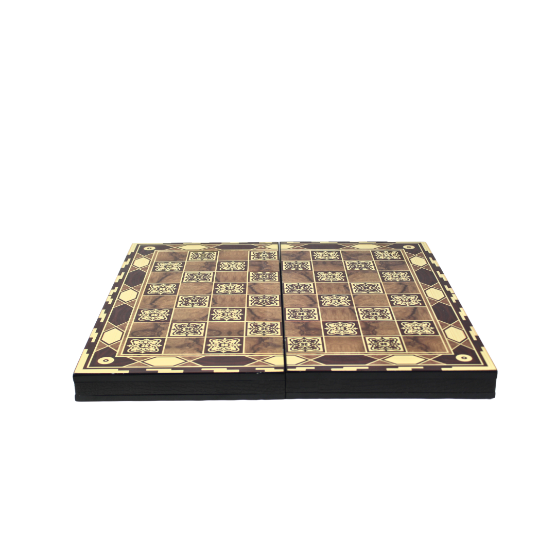 Nuestros juegos de Backgammon Premium están elaborados con meticulosa atención al detalle y materiales de calidad. Comenzamos utilizando MDF de primera calidad de 16 mm y 4 mm para la estructura principal. El diseño se transfiere al tablero, y luego los tableros de backgammon pasan por un proceso de protección con tres capas de barniz para salvaguardar la superficie. Después, se aplican tres capas de barniz de poliuretano brillante para lograr un acabado suave.