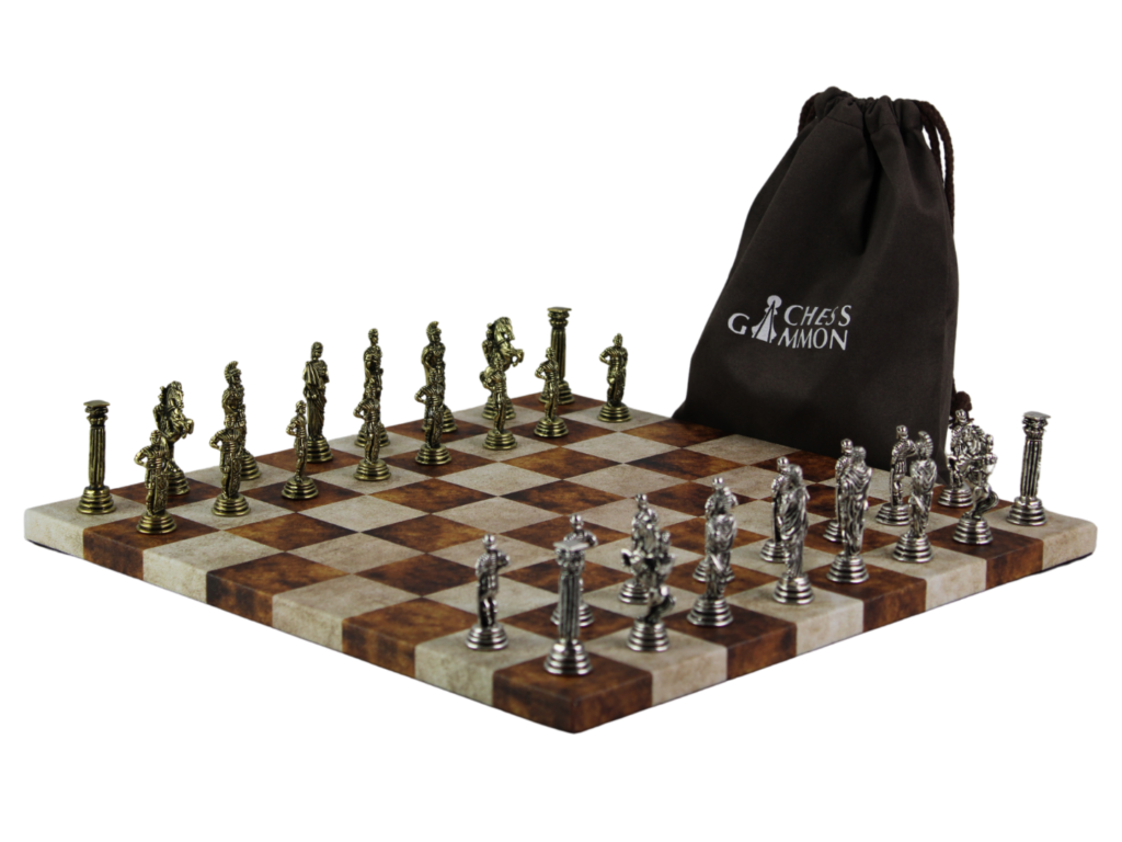 Juego de ajedrez de metal personalizado con tablero de cuero sintetico marron y bolsa con cordon de 14 pulgadas