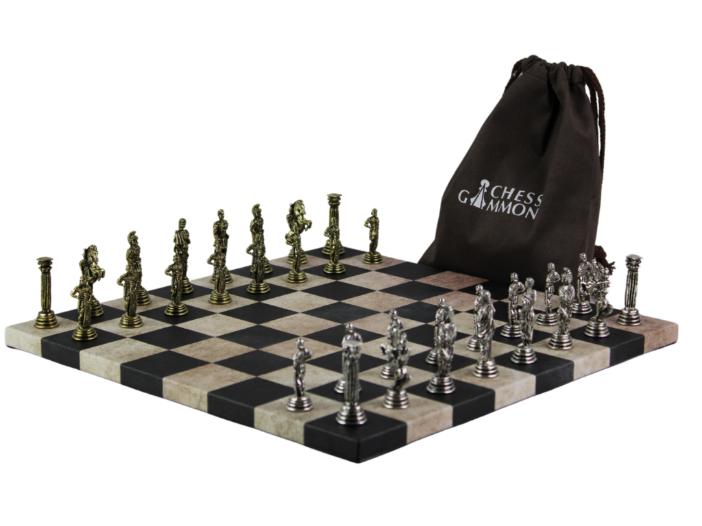 Juego de ajedrez de metal personalizado con tablero de cuero sintetico negro y bolsa de cordon de 14 pulgadas