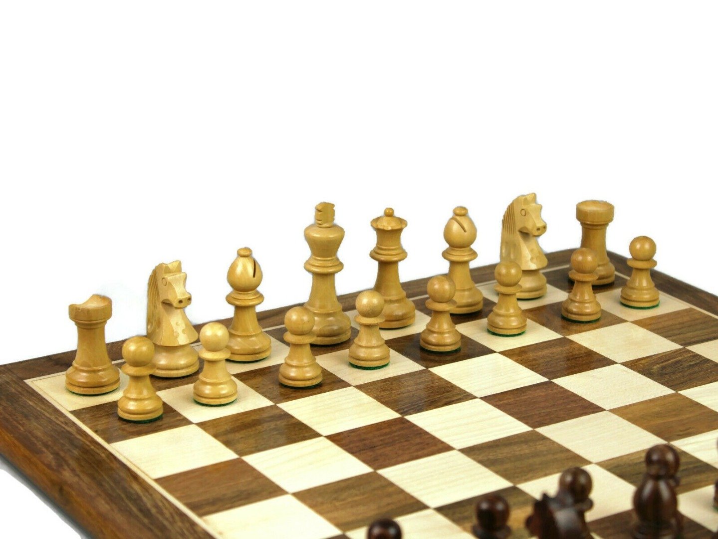 Este es un juego de ajedrez con un hermoso tablero plano de Sheesham, hecho a mano con incrustaciones de madera. Un maravilloso juego de ajedrez hecho en India. Las piezas del set están hechas de madera y han sido delicadamente elaboradas a mano con precisión y destreza intrincada. Cada pieza está intrincadamente tallada con destreza manual. Incluimos una caja de almacenamiento de ajedrez de alta calidad en madera de caoba para mantener tus piezas de ajedrez seguras y protegidas. Comúnmente conocido como Staunton Alemán y, a veces, llamado set de ajedrez Downhead. Este set está hecho de bloques de madera con fieltro en cada pieza para evitar daños a la superficie del tablero de ajedrez. Estas piezas de ajedrez Staunton Alemanas están pulidas para dar un acabado natural por hábiles artesanos que diseñan algunos de los juegos de ajedrez más famosos y de alta calidad del mundo. Un set Downhead o Staunton Alemán se caracteriza comúnmente por el caballo, con líneas diagonales en movimiento y una boca cerrada, casi con una naturaleza obstinada. Una torre robusta y un alfil grabado le dan a este set único su nombre. Cada pieza también está fuertemente ponderada para evitar que se vuelquen, seguida de la aplicación de fieltro a cada pieza para proteger la superficie de juego. Chessgammon tiene estos diseños de piezas de ajedrez Staunton hechos por los mejores y más hábiles artesanos en Amritsar, India.