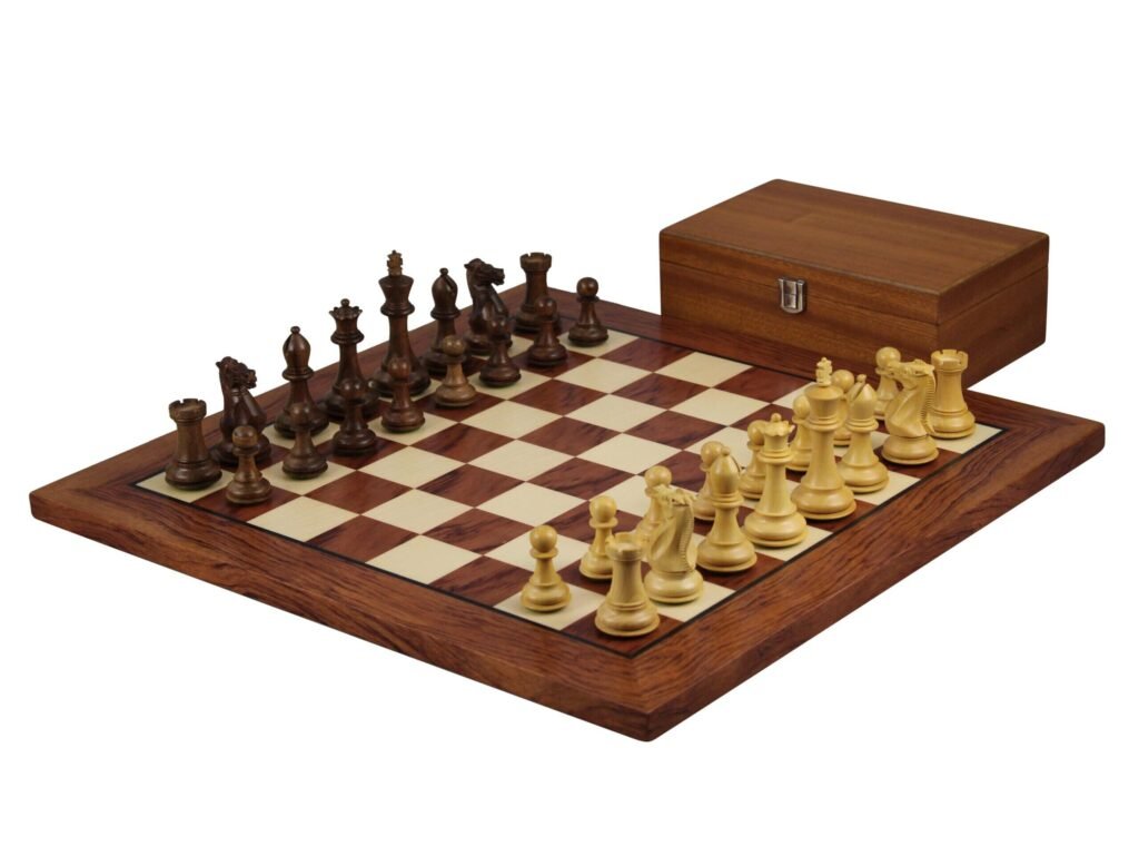 Juego de Ajedrez de Palisandro de 20 Pulgadas con Tablero Plano Helena y Piezas de Ajedrez Ponderadas de Sheesham Serie Morphy Staunton de 3.75 Pulgadas