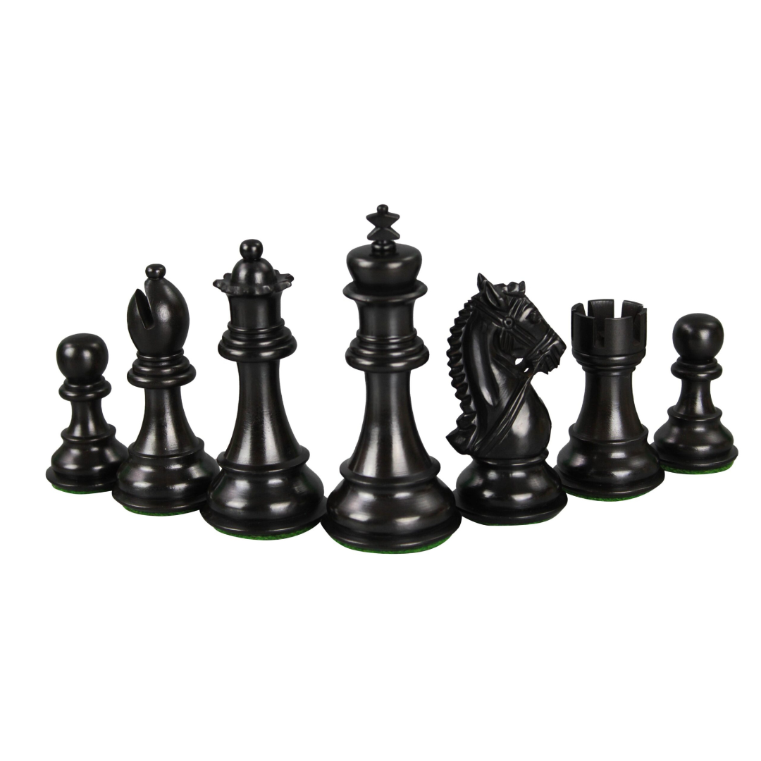 Además, el conjunto incluye una magnífica caja de almacenamiento para las piezas de ajedrez, elegantemente chapada en madera de ébano. Esta espaciosa caja acomoda piezas de ajedrez que varían entre 3 y 4 pulgadas, diseñada con compatibilidad y protección en mente. El interior de la caja está adornado con lujoso fieltro de terciopelo negro, proporcionando un refugio acolchado para proteger tus preciadas piezas de ajedrez.