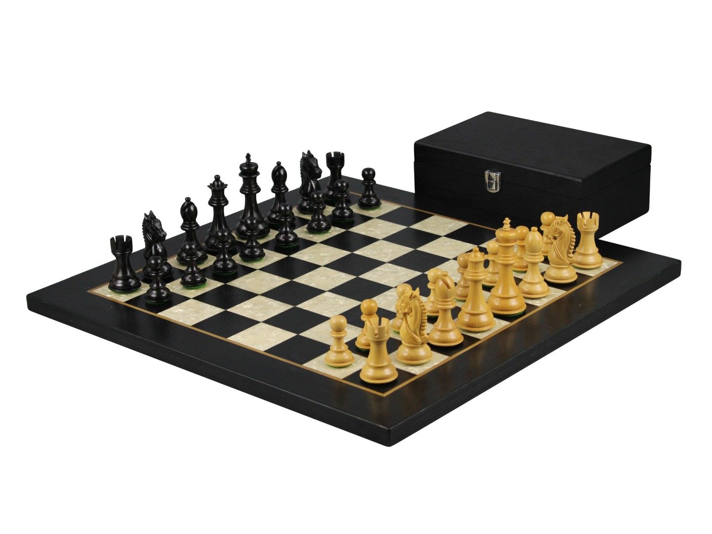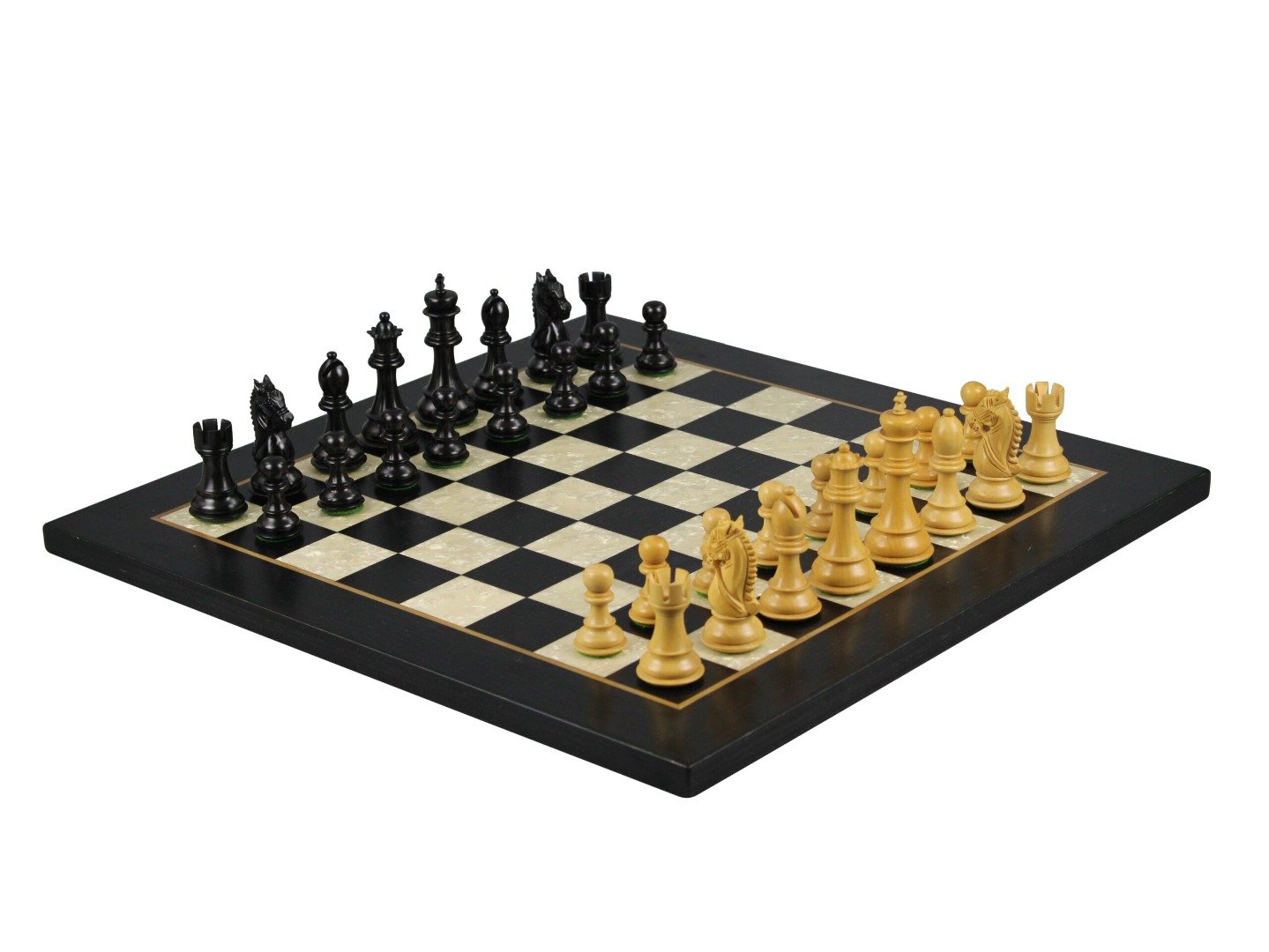 Juego de Ajedrez de Ebano de 20 pulgadas con Tablero Plano Helena de Nacar y Piezas de Ajedrez Staunton Ebonizadas y Ponderadas »King Bridal» de 3.75 pulgadas